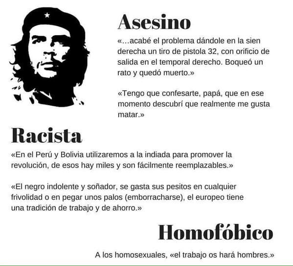 El Che, quien fue una figura clave en la revolución cubana, y asimismo, luchó para incitar revoluciones comunistas en varios países de América del Sur, ha sido durante mucho tiempo el ídolo de los adolescentes de izquierda y estudiantes universitarios de Occidente, debido a la popularidad de algunas frases memorables en contra del consumismo en sus obras.