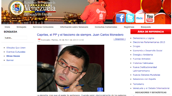 Lo hizo en un artículo titulado Capriles, el PP y el fascismo de siempre que el propio Gobierno venezolano difundió a través de la página web de su Ministerio del Poder Popular para Relaciones Exteriores.