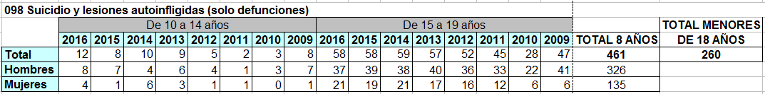 Los 260 menores suicidados de los últimos 8 años informados por el INE dentro de 098, los pego aquí sin editar cifra alguna salvo los totales de la derecha que los facilito yo: