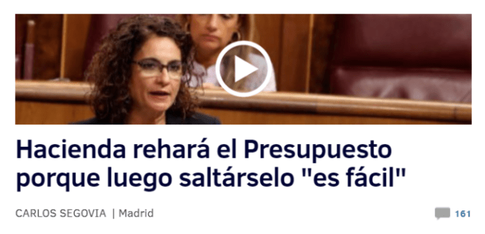 Me molesta mucho este titular. Transmite algo que no es cierto. La ministra no dice que van a rehacer el presupuesto porque saltárselo sea fácil. Ni siquiera lo dice en el corte que aparece en la noticia, en la que interesadamente no se incluye la pregunta. Más evidente es que no lo dice si la añadimos. Aquí está el corte con la pregunta.