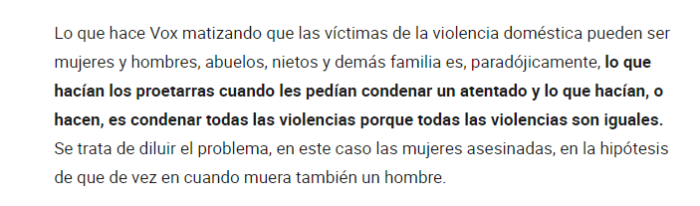 Hay comparaciones chungas y esta es una de ellas. Los proetarras no condenaban todas las violencias, sino que se negaban a condenar los crímenes de ETA porque estaban de acuerdo con ellos. Si Vox dice que un asesinato de un marido a manos de su esposa es igual al asesinato de una esposa a manos de su marido lo que afirma es tan robusto que Manuel va a tener difícil rebatirlo.