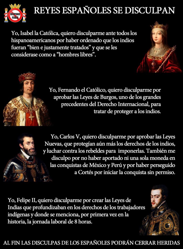 También el papa Paulo III debería disculparse por su bula Sublimis Deus en la que instaba a España a seguir tomando medidas en favor de los derechos de los indígenas. Y Hernán Cortés también debe pedir perdón por fundar México y ser el primer responsable de la existencia de todos los mestizos y blancos que habitan el país.